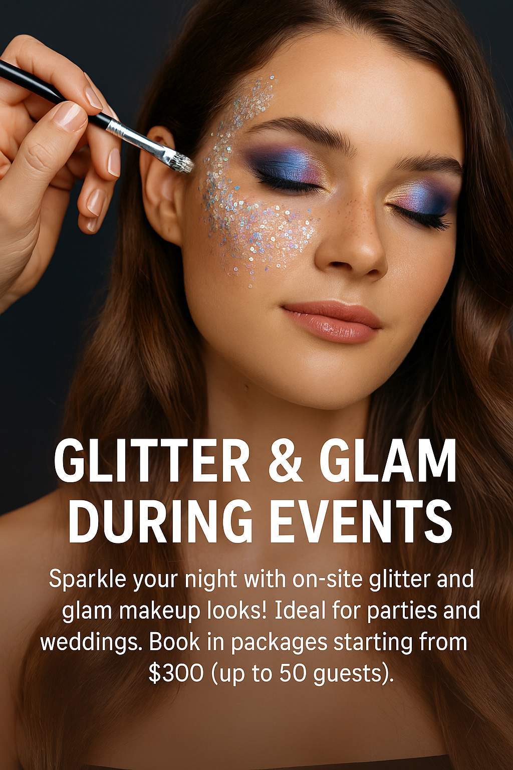Turn your party, wedding, or event into a sparkling experience! Our on-site Glitter & Glam Makeup Package offers professional application of shimmering, stylish looks for you and your guests. Perfect for weddings, birthdays, corporate parties, and special celebrations.