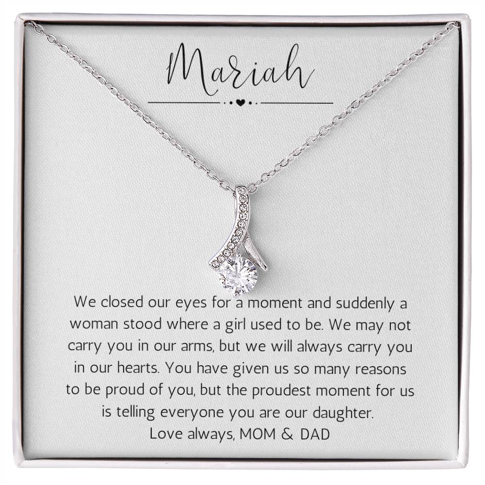 "[HER NAME] We closed our eyes for a moment and suddenly a woman stood where a girl used to be. We may not carry you in our arms, but we will always carry you in our hearts. You have given us so many reasons to be proud of you, but the proudest moment for us is telling everyone you are our daughter. Love always, MOM & DAD"