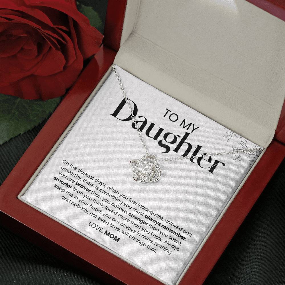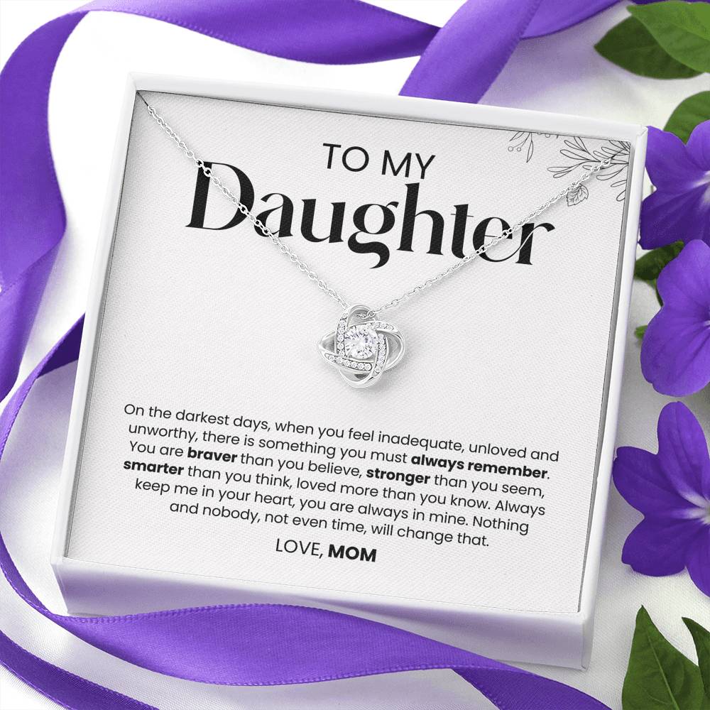 The love knot necklace represents an unbreakable bond between mom and daughter’s souls.