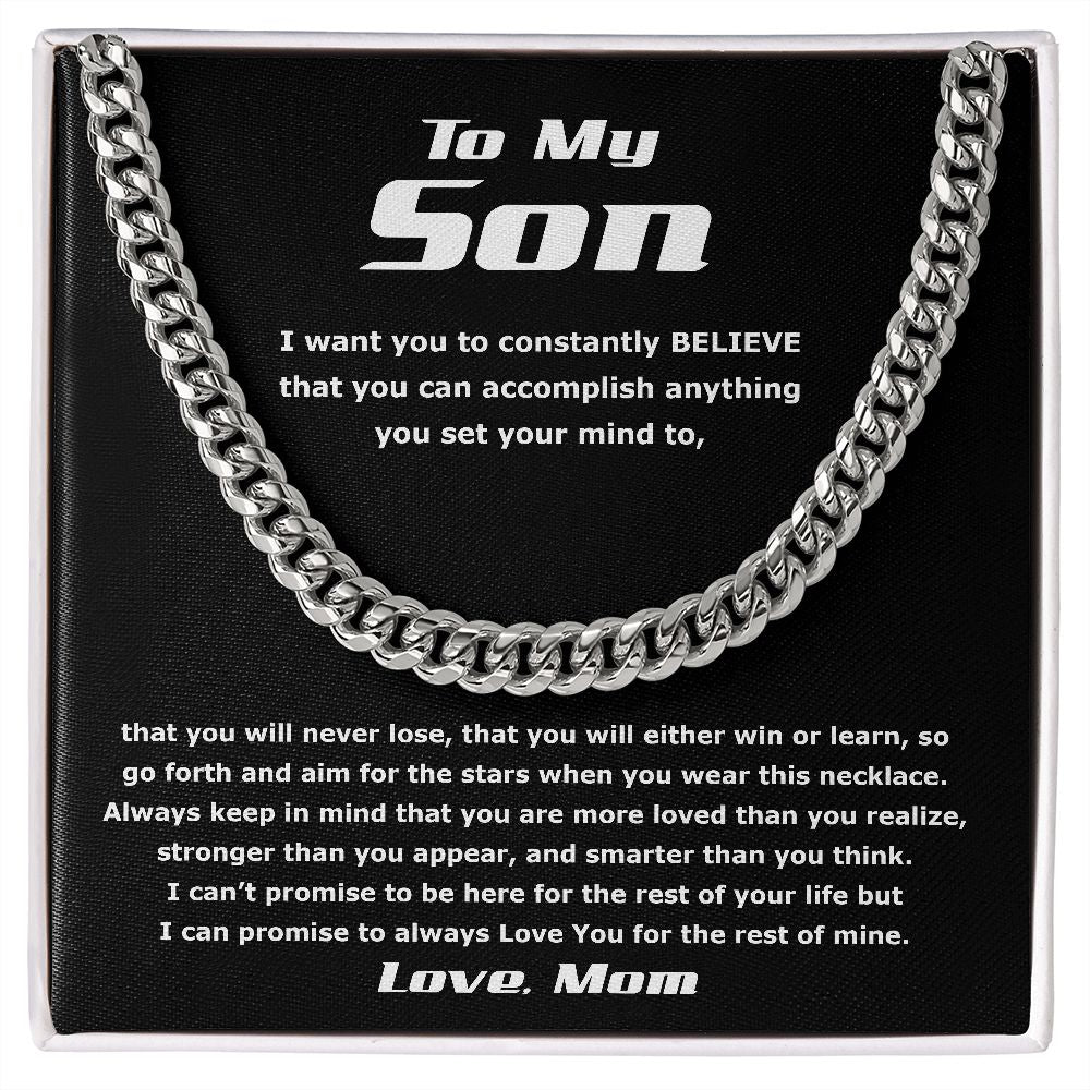 "I want you to constantly BELIEVE that you can accomplish anything you set your mind to, that you will never lose, that you will either win or learn, so go forth and aim for the stars when you wear this necklace. Always keep in mind that you are more loved than you realize, stronger than you appear, and smarter than you think. I can’t promise to be here for the rest of your life but I can promise to always Love You for the rest of mine."