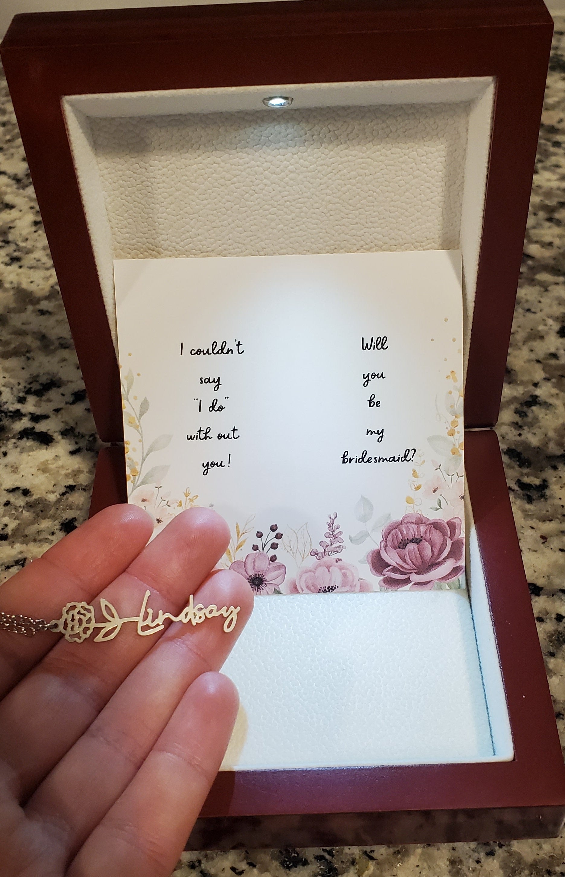 Your bridesmaids will look stunning in this dainty and personalized necklace that has her NAME and BIRTH FLOWER 🌻🌹